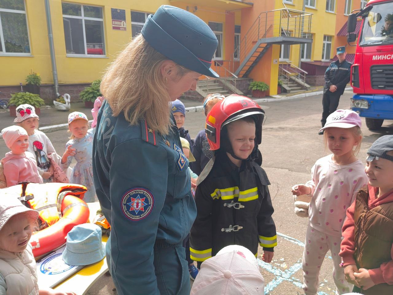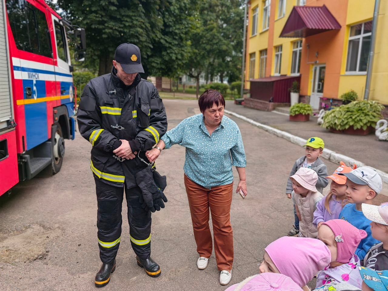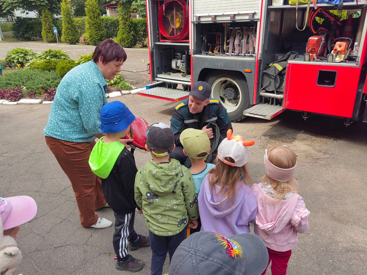 Але цэнтрам увагі малышоў стала сапраўдная пажарная машына. Дзеці пазнаёміліся з абсталяваннем спецыяльнага аўтамабіля, даведаліся якія інструменты для якіх выратавальных работ прызначаны, змаглі не толькі пакратаць, але і прымяраць баявое адзенне і каску ратавальніка.