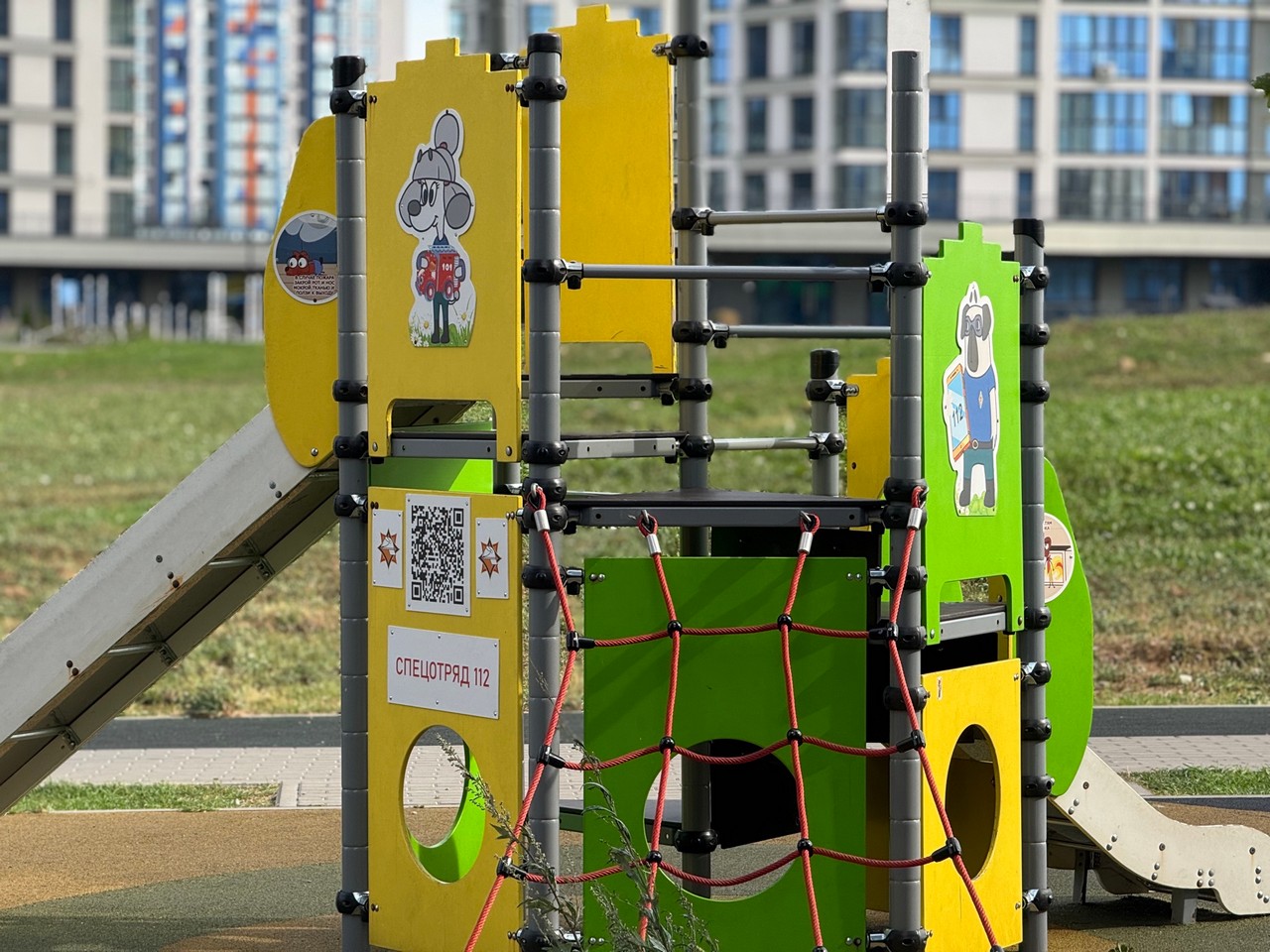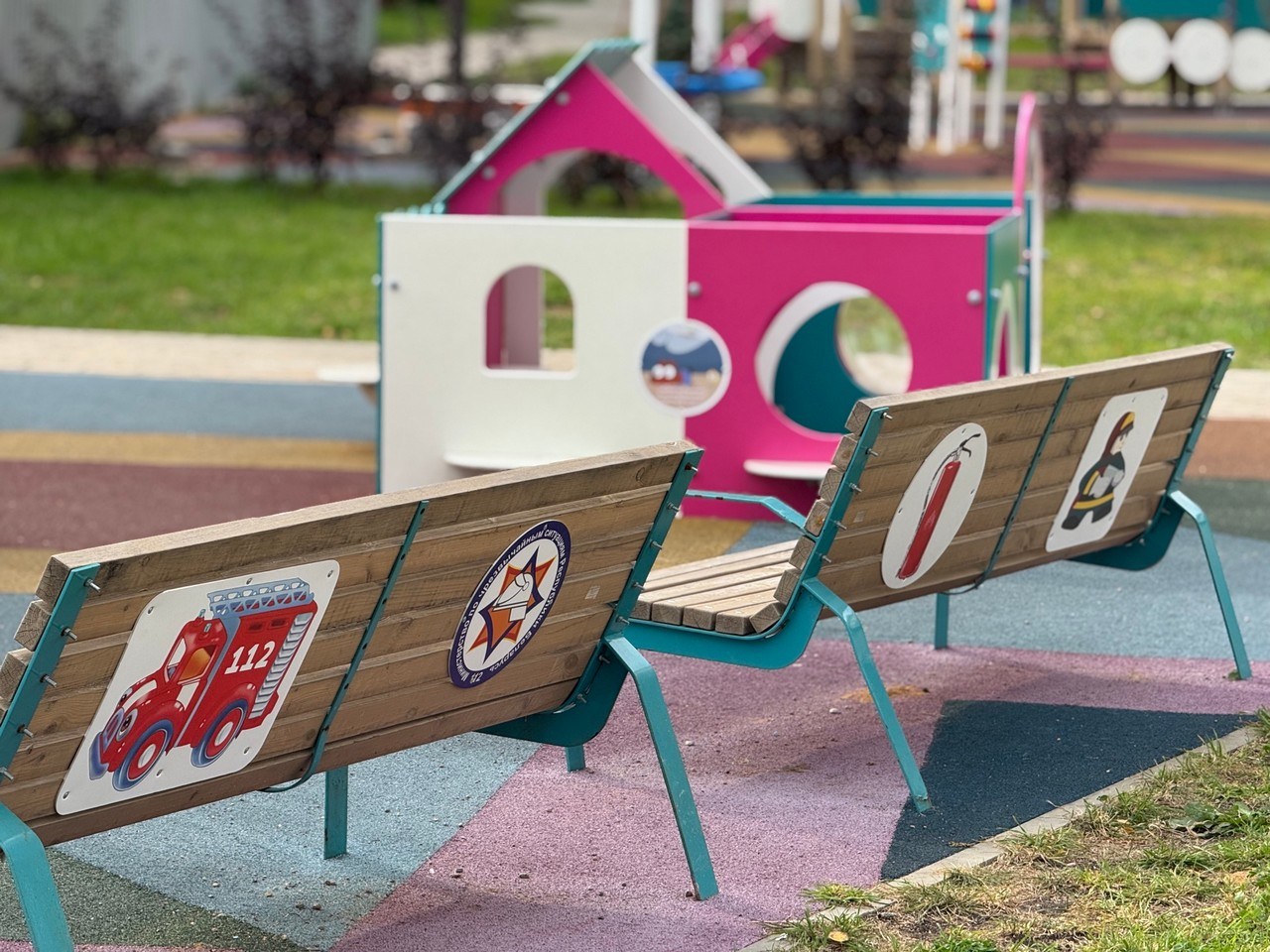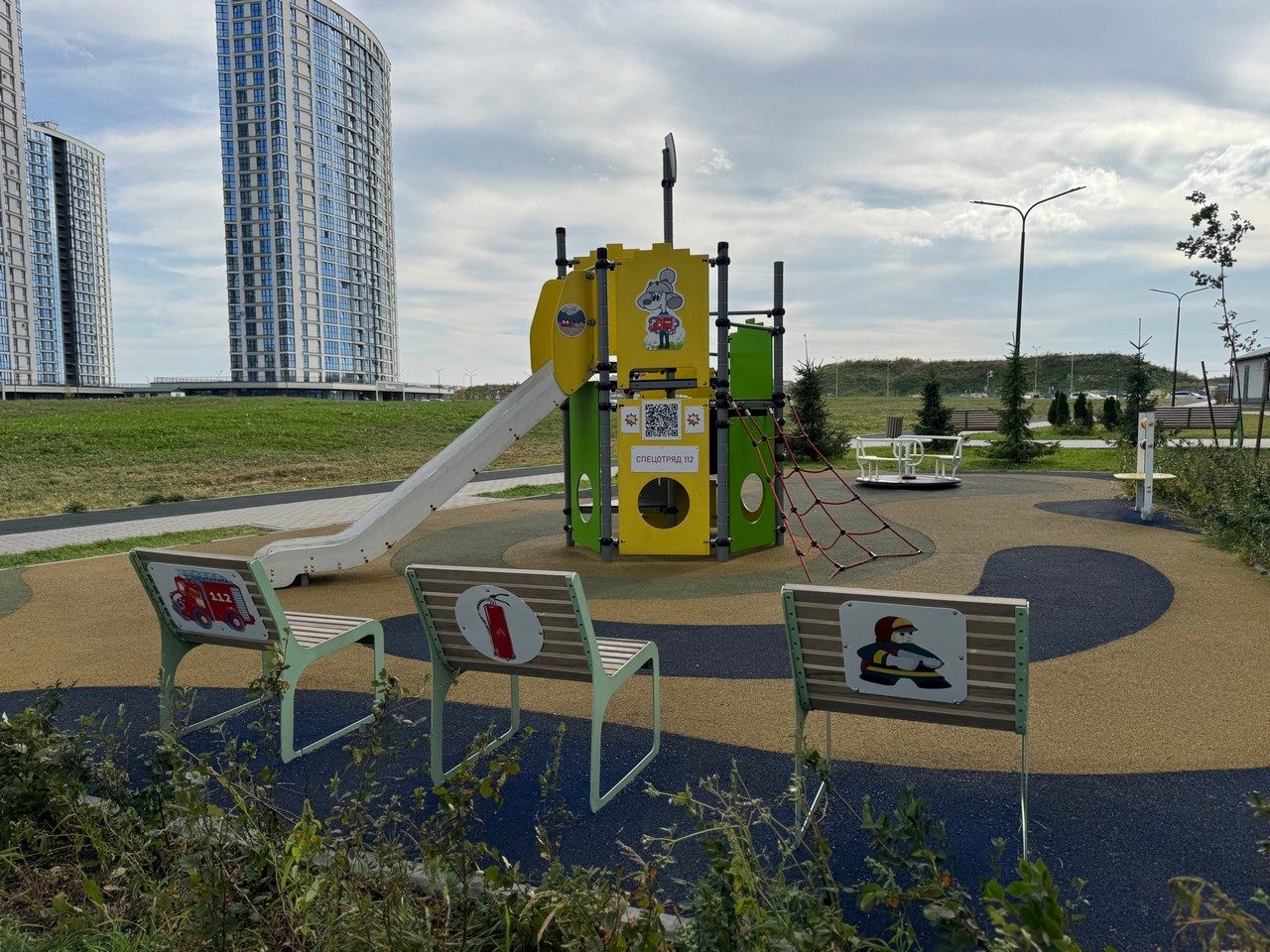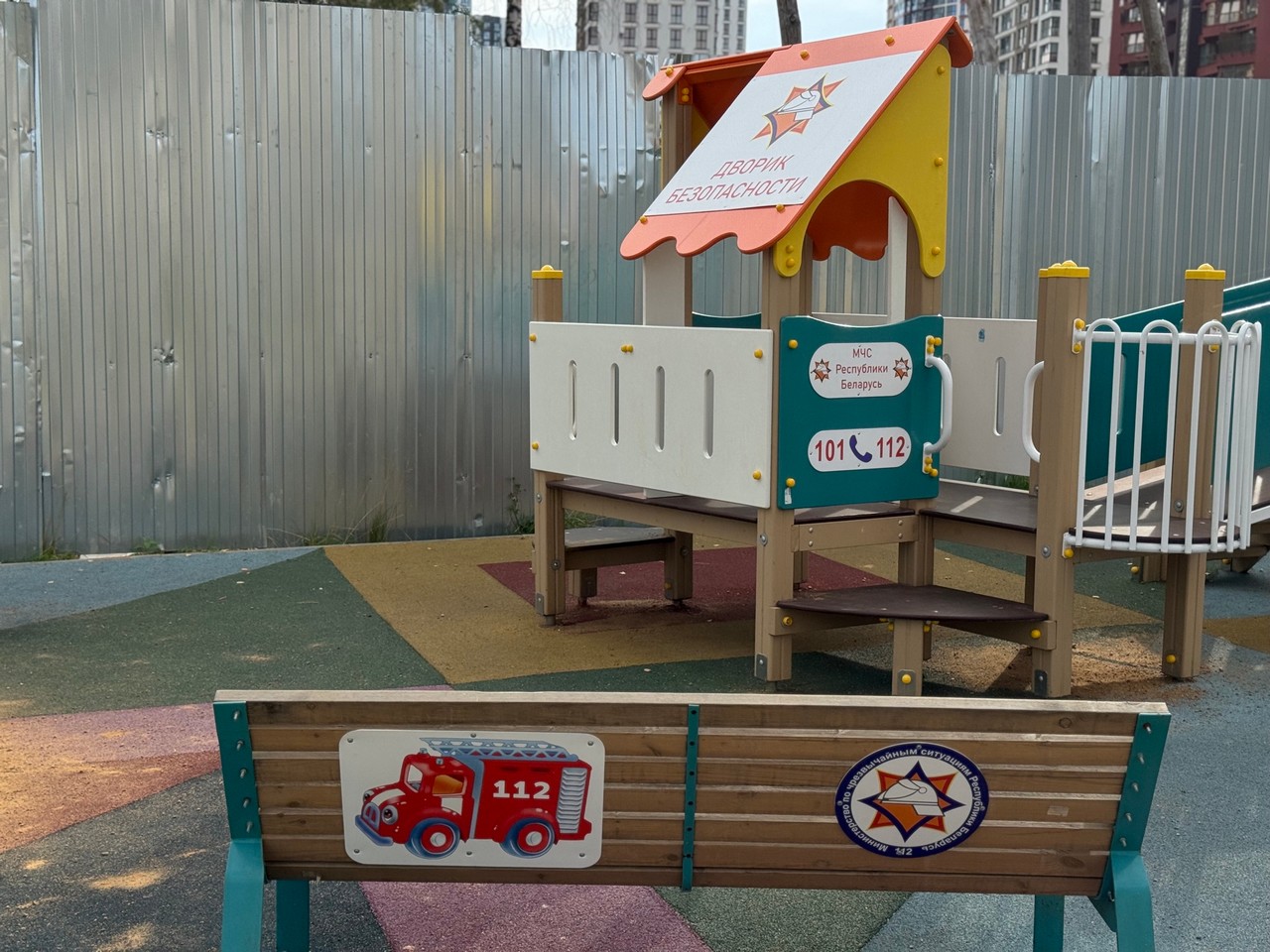 Усе элементы дзіцячай пляцоўкі абазначаны напамінкамі аб правілах бяспекі: лагатыпамі МНС, тэлефонамі выратавальных службаў «101» і «112», персанажамі мультфільмаў «Спецатрад 112» і «Чароўная кніга».
