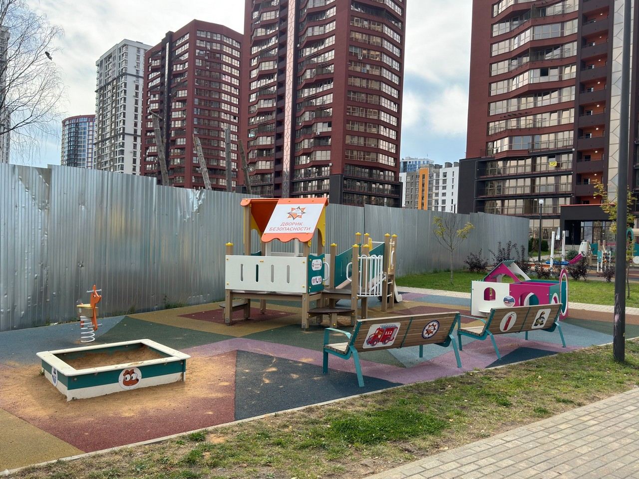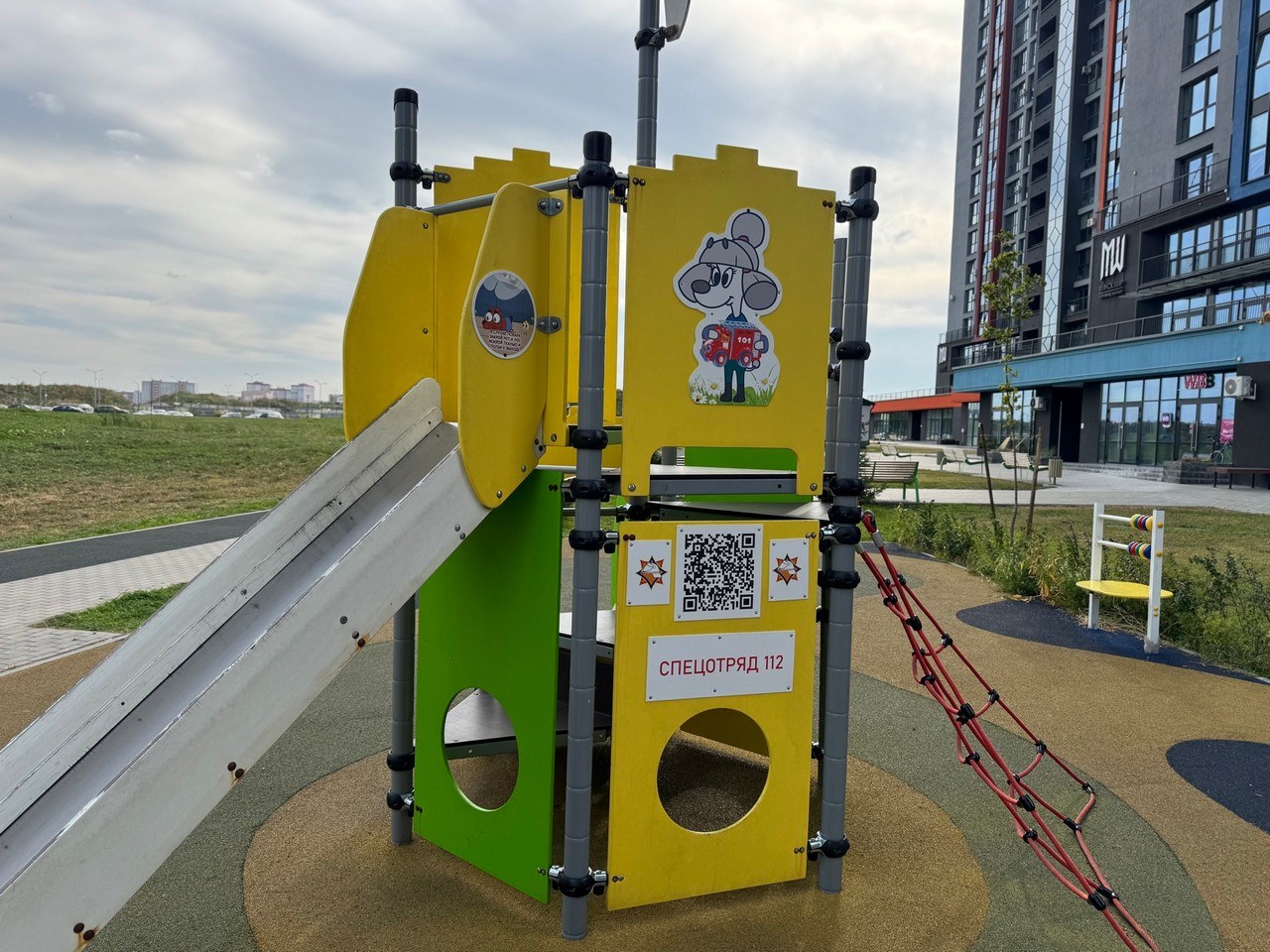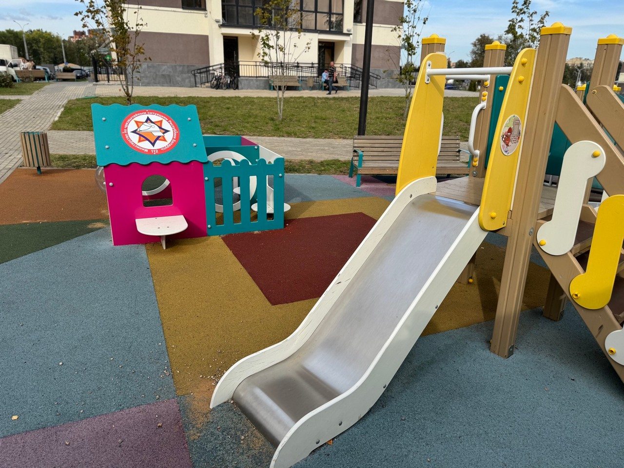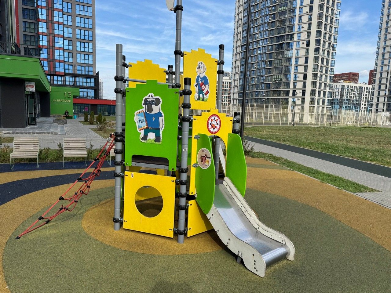 Усе элементы дзіцячай пляцоўкі абазначаны напамінкамі аб правілах бяспекі: лагатыпамі МНС, тэлефонамі выратавальных службаў «101» і «112», персанажамі мультфільмаў «Спецатрад 112» і «Чароўная кніга».