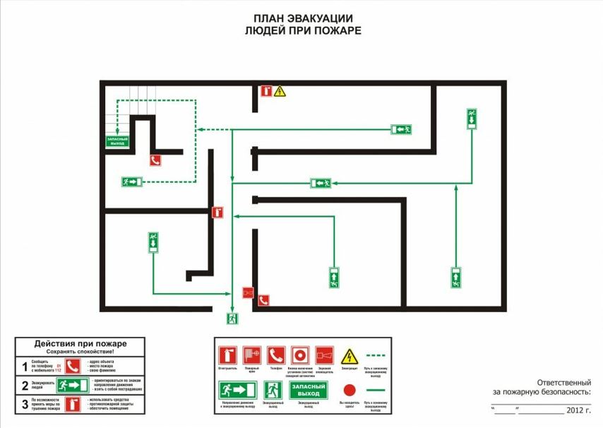 На плане эвакуации также указаны места хранения огнетушителей, расположение пожарных кранов и кнопок ручного пожарного извещателя. Это информация может оказаться жизненно важной в экстренной ситуации.
