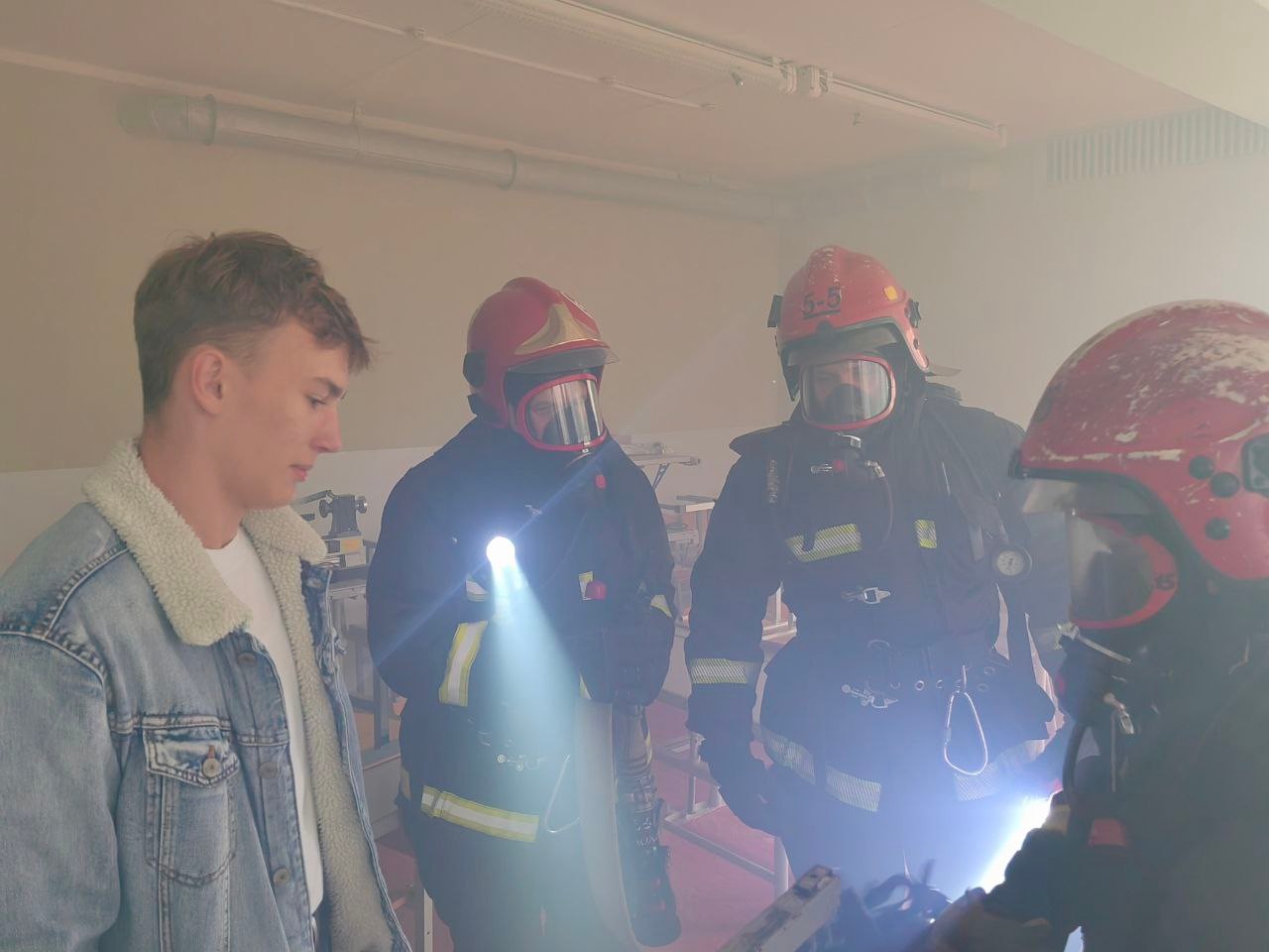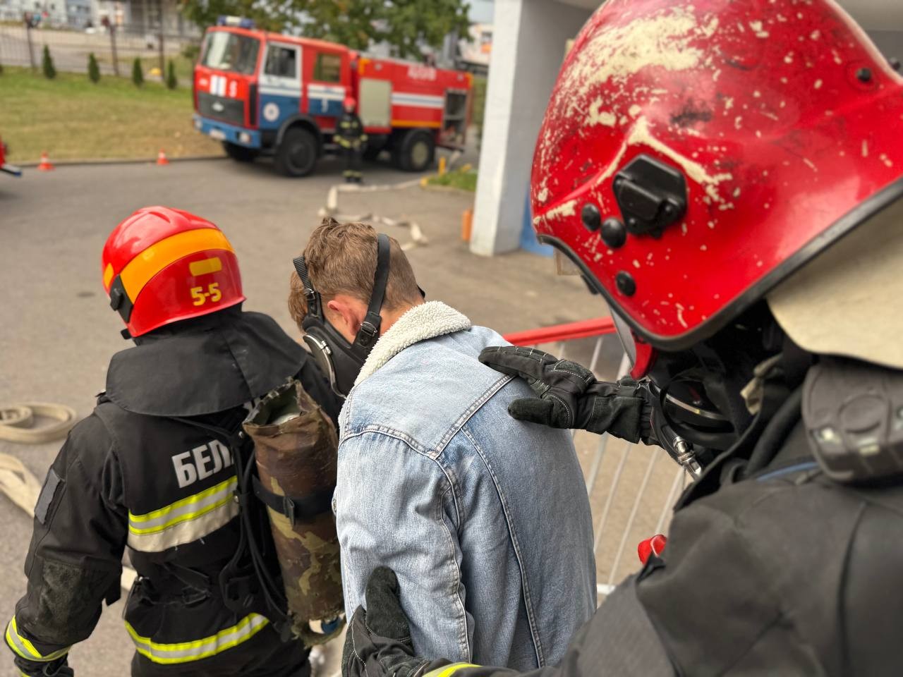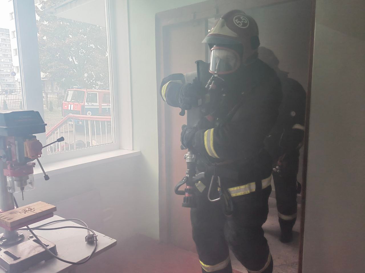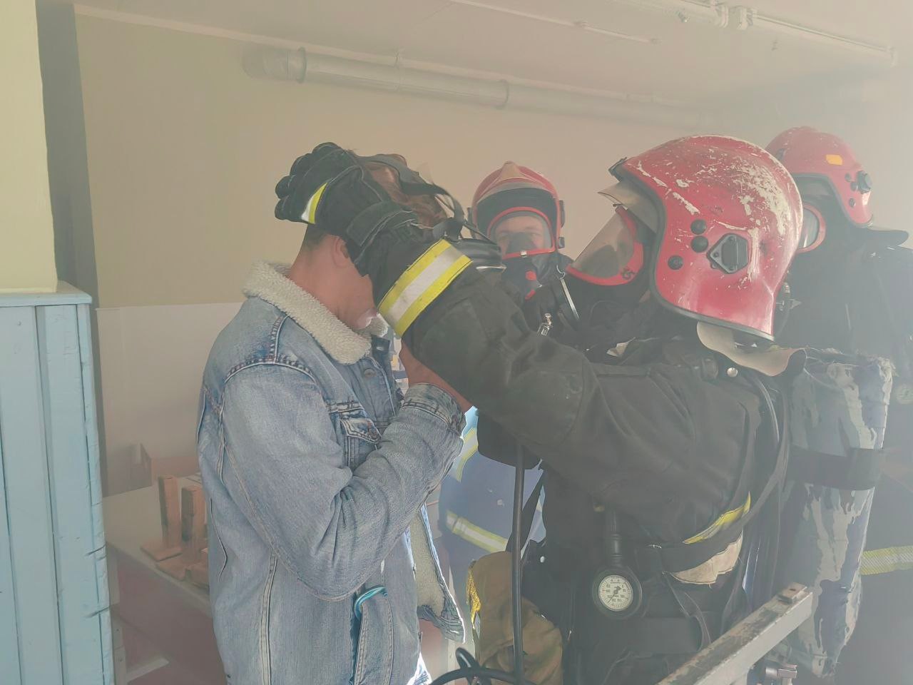 Именно этот объект образования был выбран не случайно – у государственного пожарного надзора имеются замечания по функционированию системы пожарной автоматики. По тактическому замыслу произошло условное возгорание в кабинете трудового обучения, в котором после проведения эвакуации остался один из учащихся и не смог покинуть здание самостоятельно. Прибывшие подразделения МЧС при помощи маски на спасаемого вывели условно пострадавшего в безопасную зону и приступили к тушению возгорания.