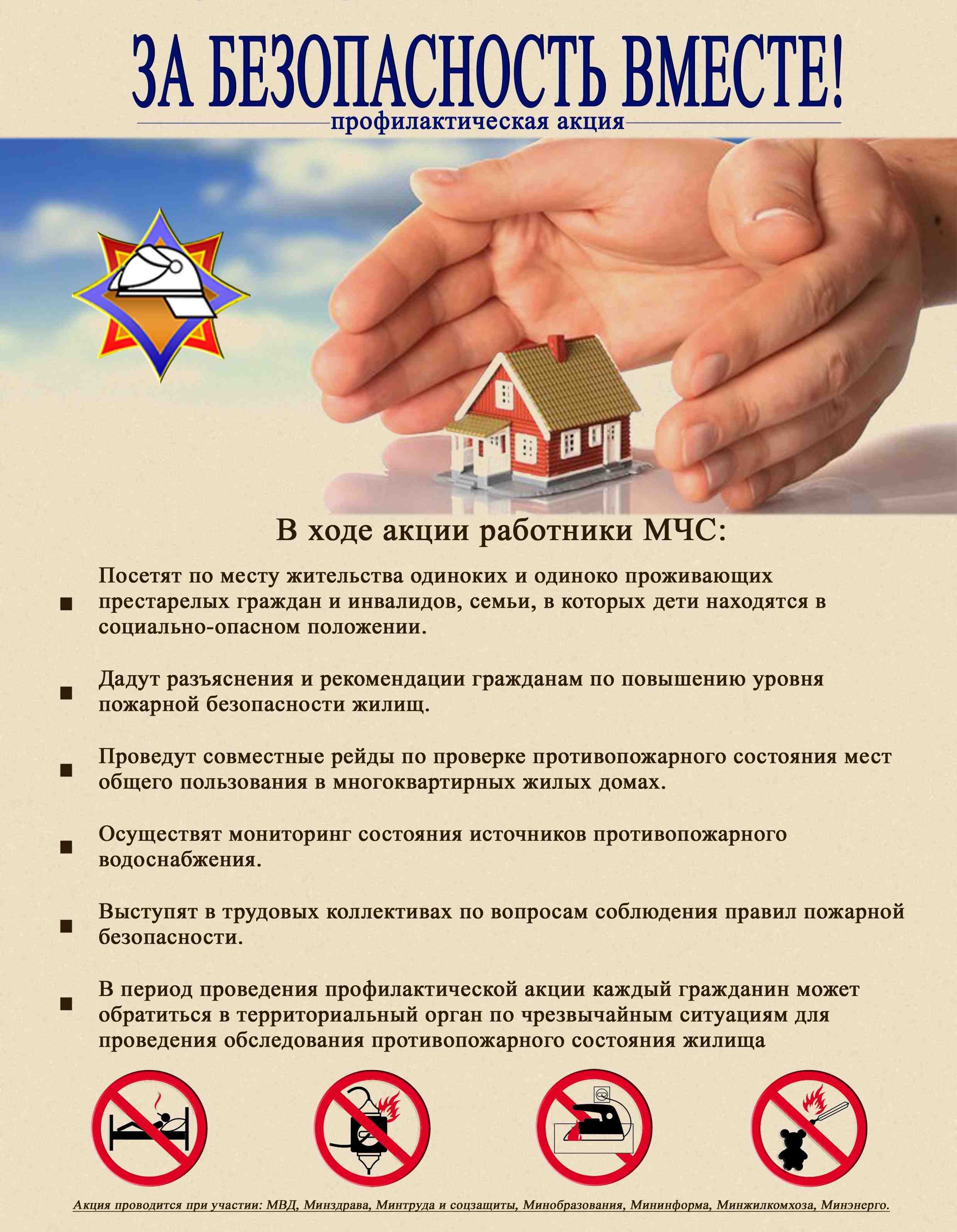 В целях повышения уровня культуры безопасности среди населения Министерством по чрезвычайным ситуациям в период с 20 октября по 6 ноября проводится республиканская пожарно-профилактическая акция «За безопасность вместе» по предупреждению пожаров и гибели людей от них в жилищном фонде в осенне-зимний пожароопасный период.