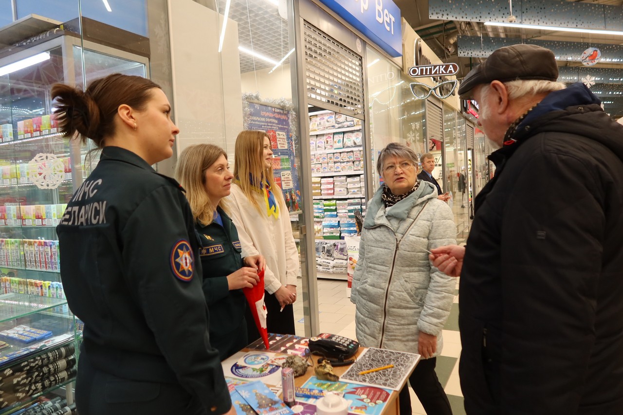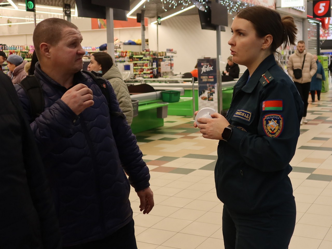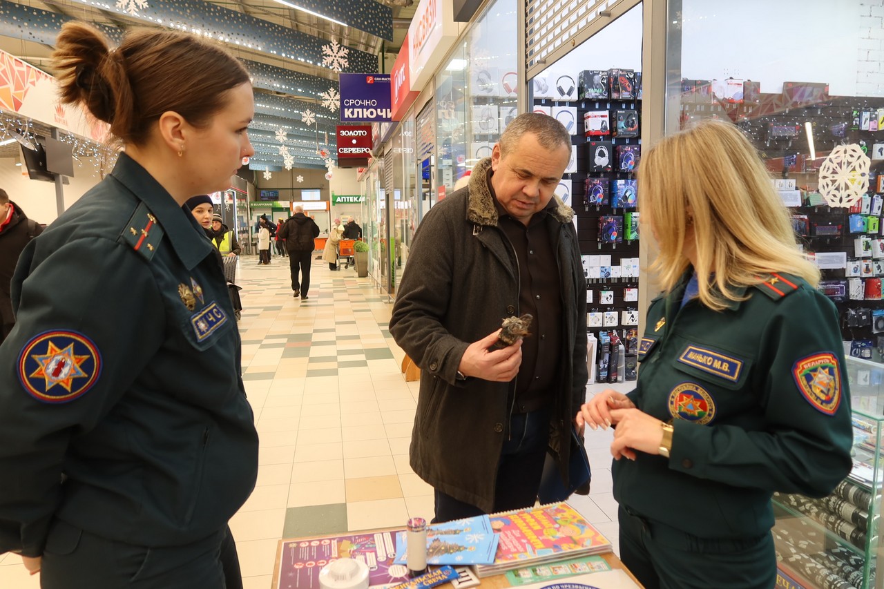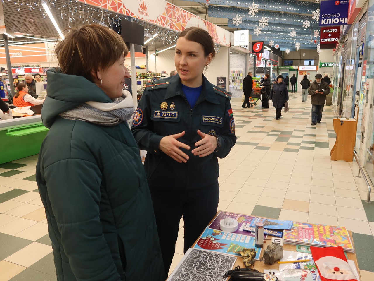 В рамках республиканской акции «Безопасный Новый год!» работники Октябрьского районного отдела по чрезвычайным ситуациям совместно с активистами Белорусской молодежной общественной организации спасателей-пожарных напомнили покупателям ТЦ «Корона-Курасовщина» о соблюдении правил безопасности в период новогодних праздников.