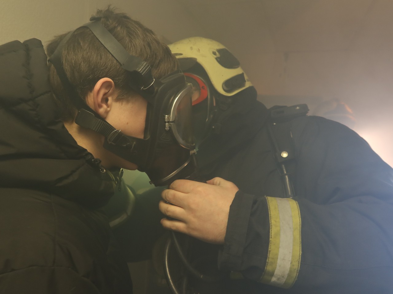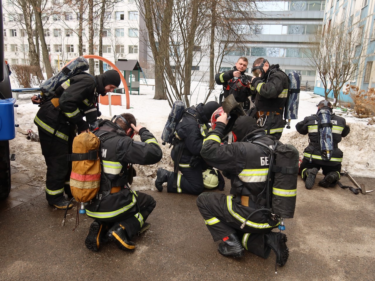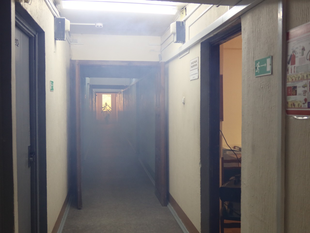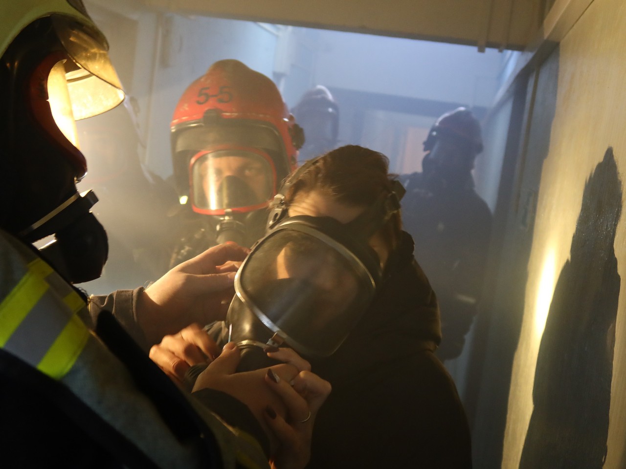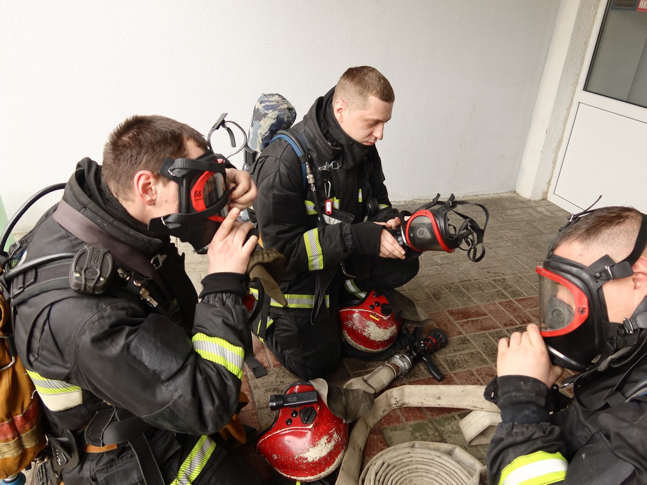 При сработке системы пожарной автоматики, проживающие в общежитиях, под управлением персонала, оперативно эвакуировались, но по легенде в горящих помещениях остались люди. Прибывшие подразделения МЧС приступили к приведению аварийно-спасательных работ. При помощи маски на спасаемого вывели условно пострадавших в безопасную зону и приступили к тушению пожара.