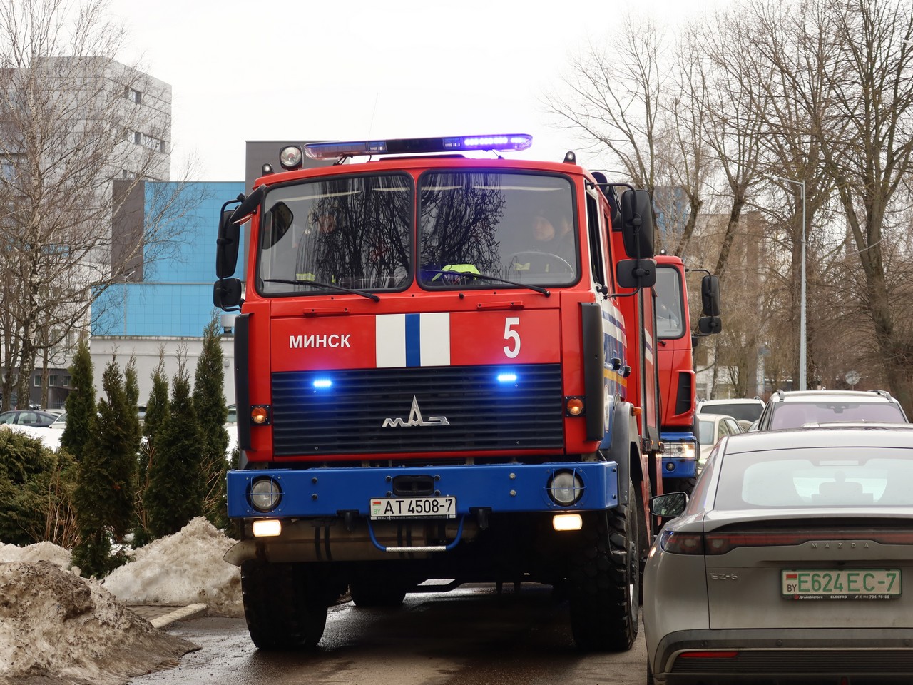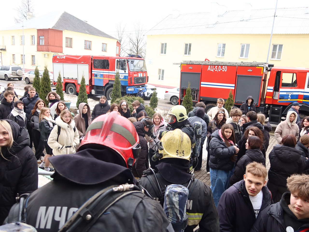 Спасатели Октябрьского района провели мероприятия по отработке действий подразделений по чрезвычайным ситуациям при тушении пожара и эвакуации жильцов при сработке систем пожарной автоматики в общежитии №24 по ул. Казинца, 27А и общежитии Минского государственного механико-технологического колледжа по ул. Казинца, 19, корпус 2.