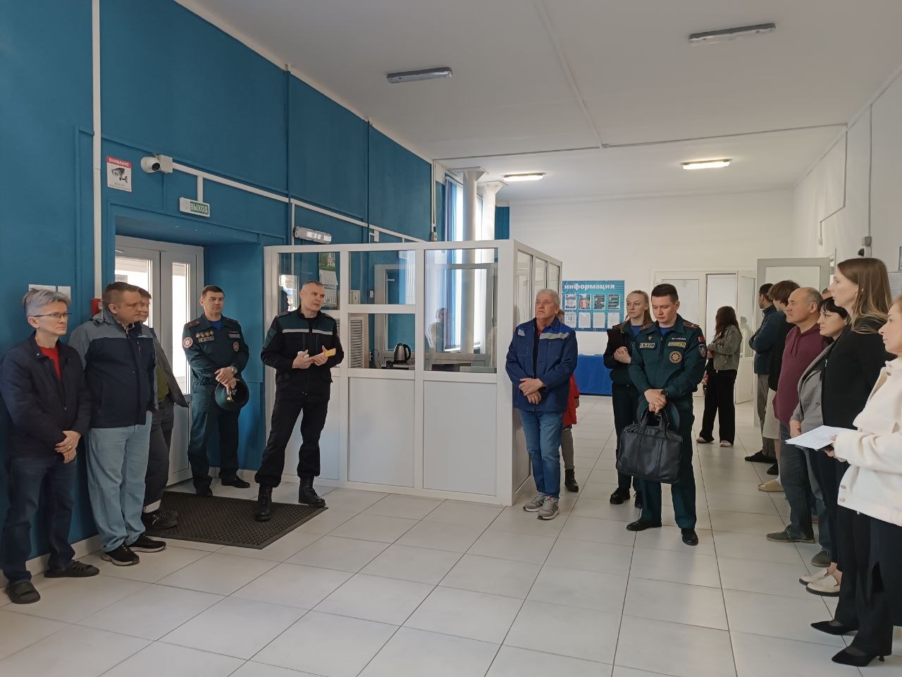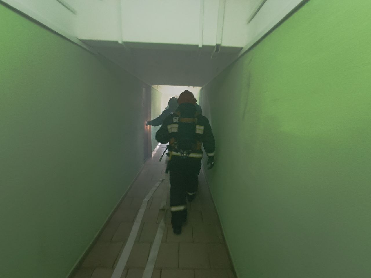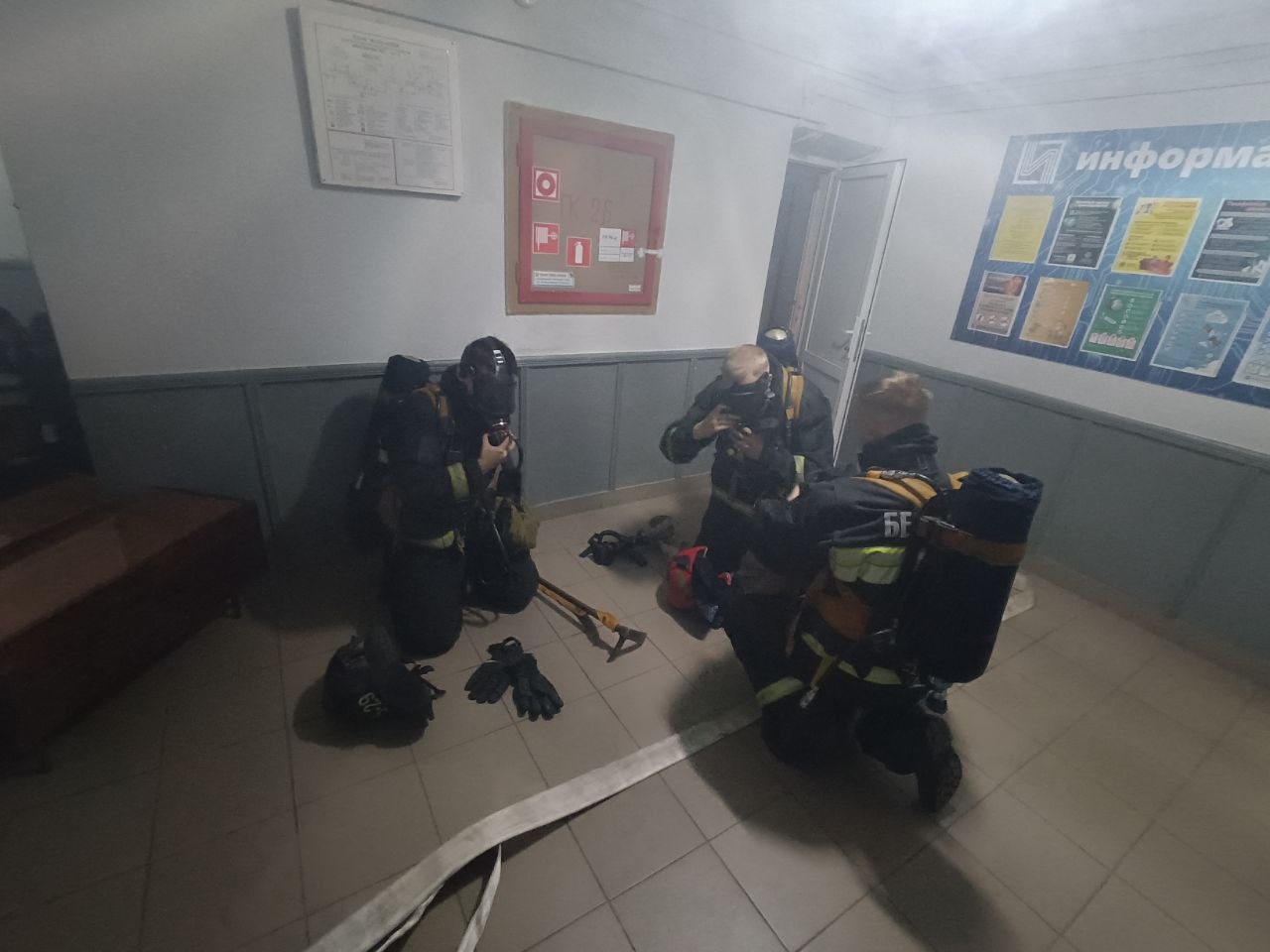 При сработке системы пожарной автоматики, под управлением персонала, проживающие в общежитиях оперативно эвакуировались, но по легенде в горящих помещениях остались люди. Прибывшие подразделения МЧС приступили к приведению аварийно-спасательных работ. При помощи маски на спасаемого вывели условных пострадавших в безопасную зону и приступили к тушению пожара.