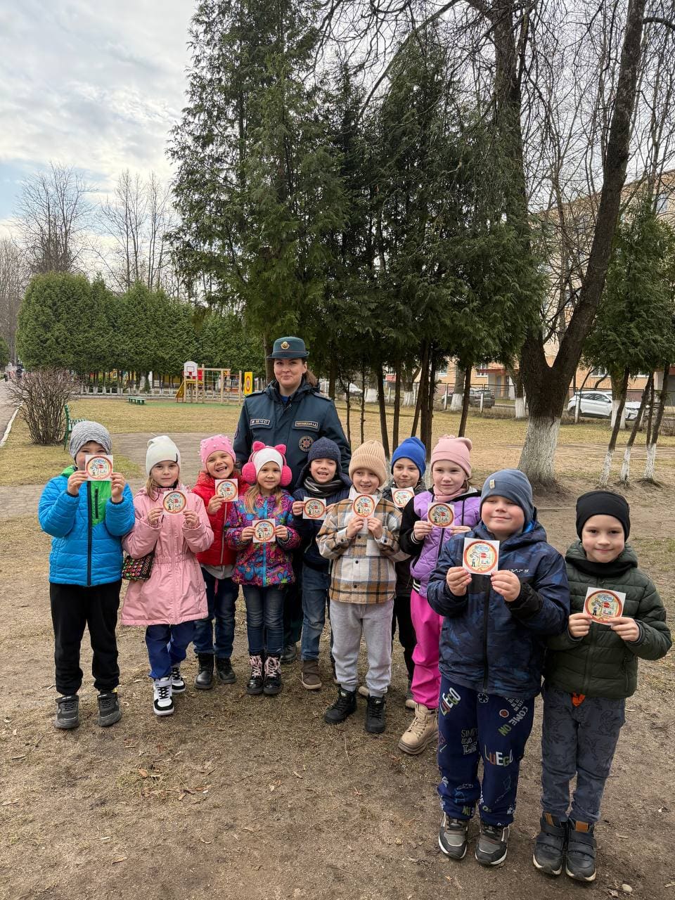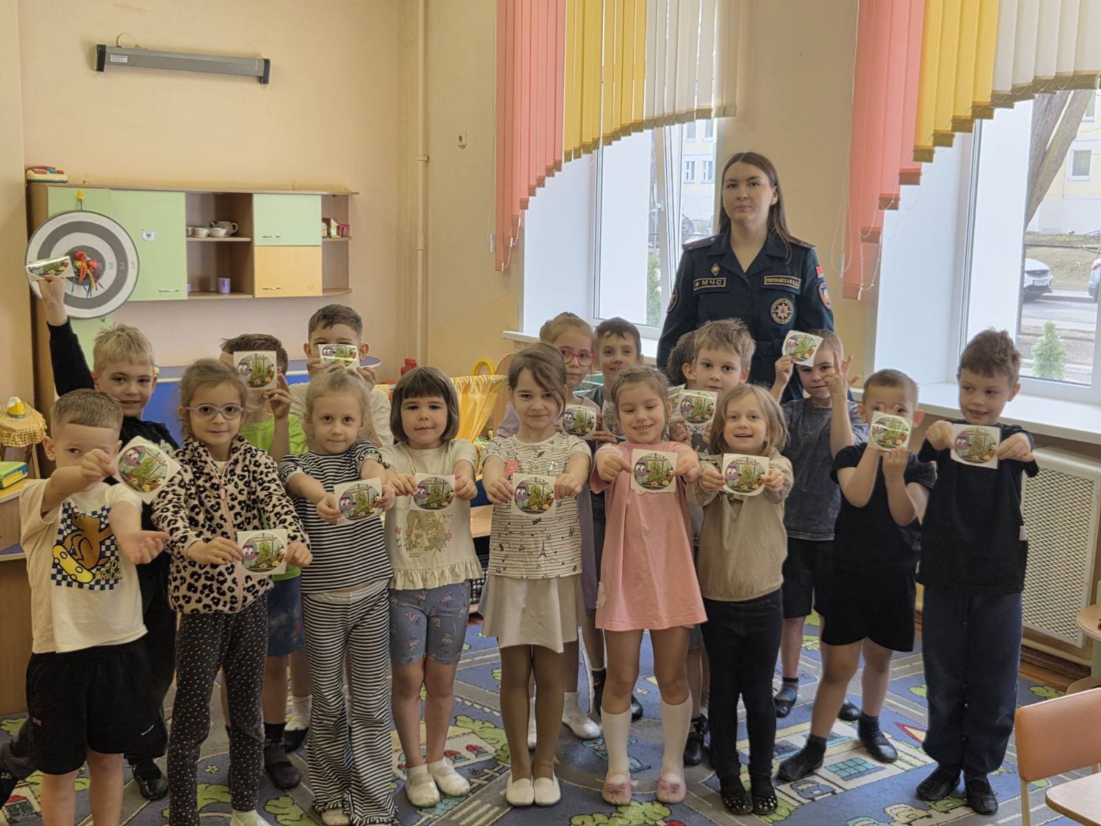 У канцы сустрэч дзеці атрымліваюць яркія тэматычныя налепкі ад МНС, якія дазволяць ім паўтараць правілы бяспекі дома разам з бацькамі.
