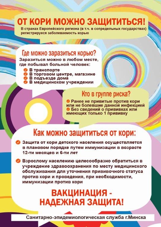 В настоящее время бесплатно проводится прививка от кори детям, молодежи в возрасте 20-29 лет. Лицам другого возраста не привитые от кори, привитые однократно, не болевшие, планирующие выезд в страны, неблагополучные по данному заболеванию, могут привиться в УЗ «29-я городская поликлиника» (запись по телефону 354 37 77) или в городском центре вакцинопрофилактики (на платной основе) (телефон 390-95-66). Лучше привиться, как минимум, за три-четыре недели до выезда